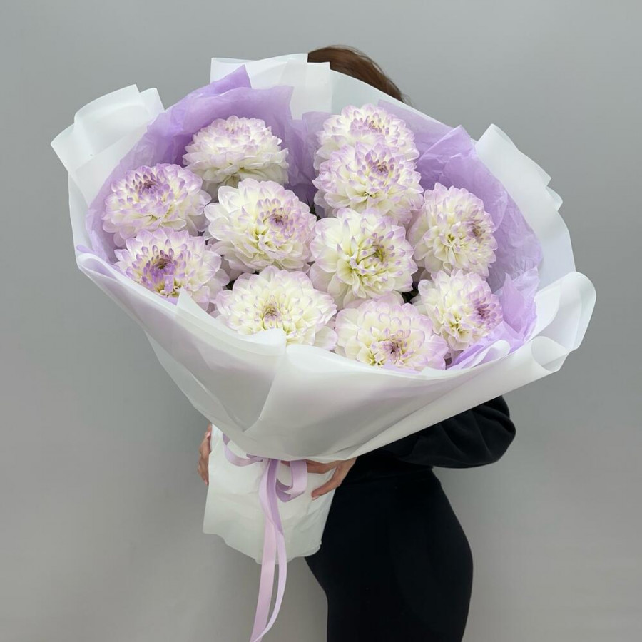 На фото букет из 11 белых георгин. В составе: георгина 11 шт, дизайнерская упаковка 1 шт, атласная лента 1 шт, . Все цветы свежие и ароматные, букет красиво оформлен и отлично подходит для подарка. Доступна доставка цветов или самовывоз.