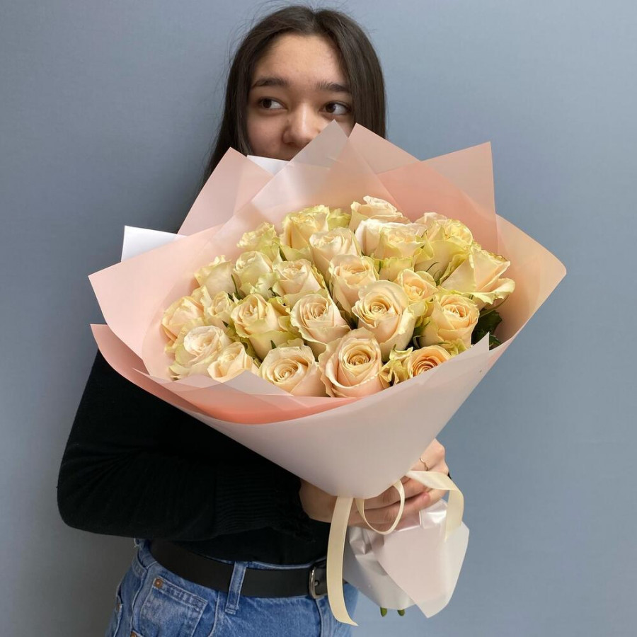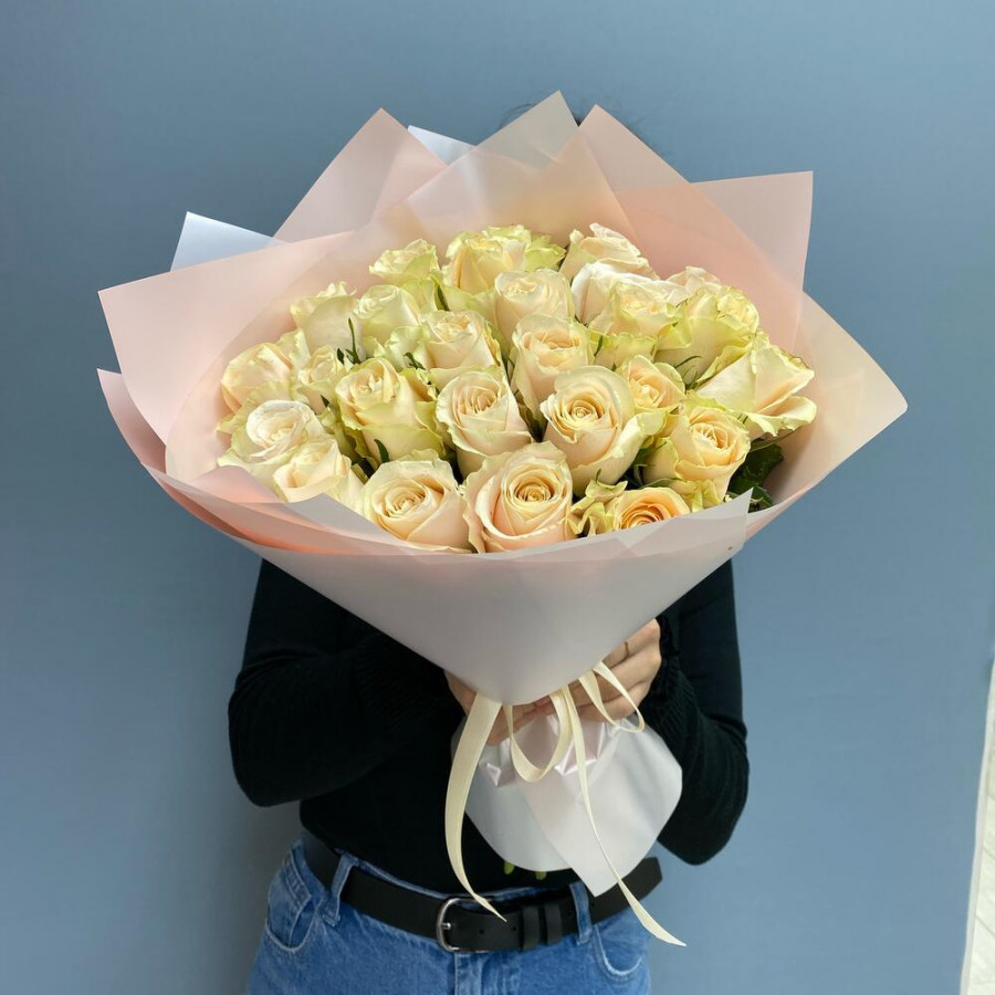 На фото букет из 25 кремовых роз. В составе: роза 25 шт, дизайнерская упаковка 2 шт, атласная лента 2 шт, . Все цветы свежие и ароматные, букет красиво оформлен и отлично подходит для подарка. Доступна доставка цветов или самовывоз.