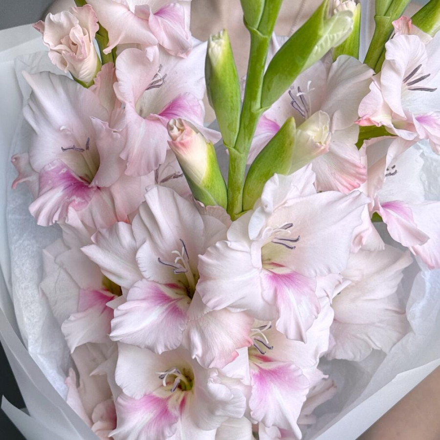 На фото букет из 3 розовых гладиолуса. В составе: гладиолус 3 шт, дизайнерская упаковка 1 шт, атласная лента 2 шт, . Все цветы свежие и ароматные, букет красиво оформлен и отлично подходит для подарка. Доступна доставка цветов или самовывоз.