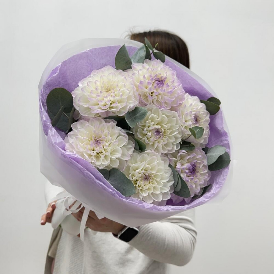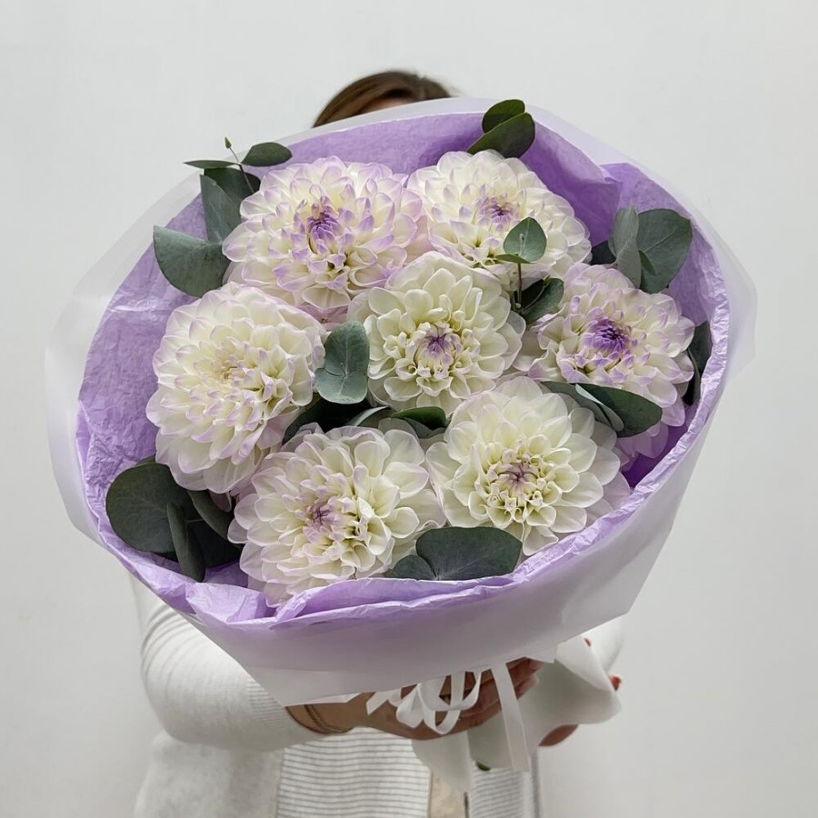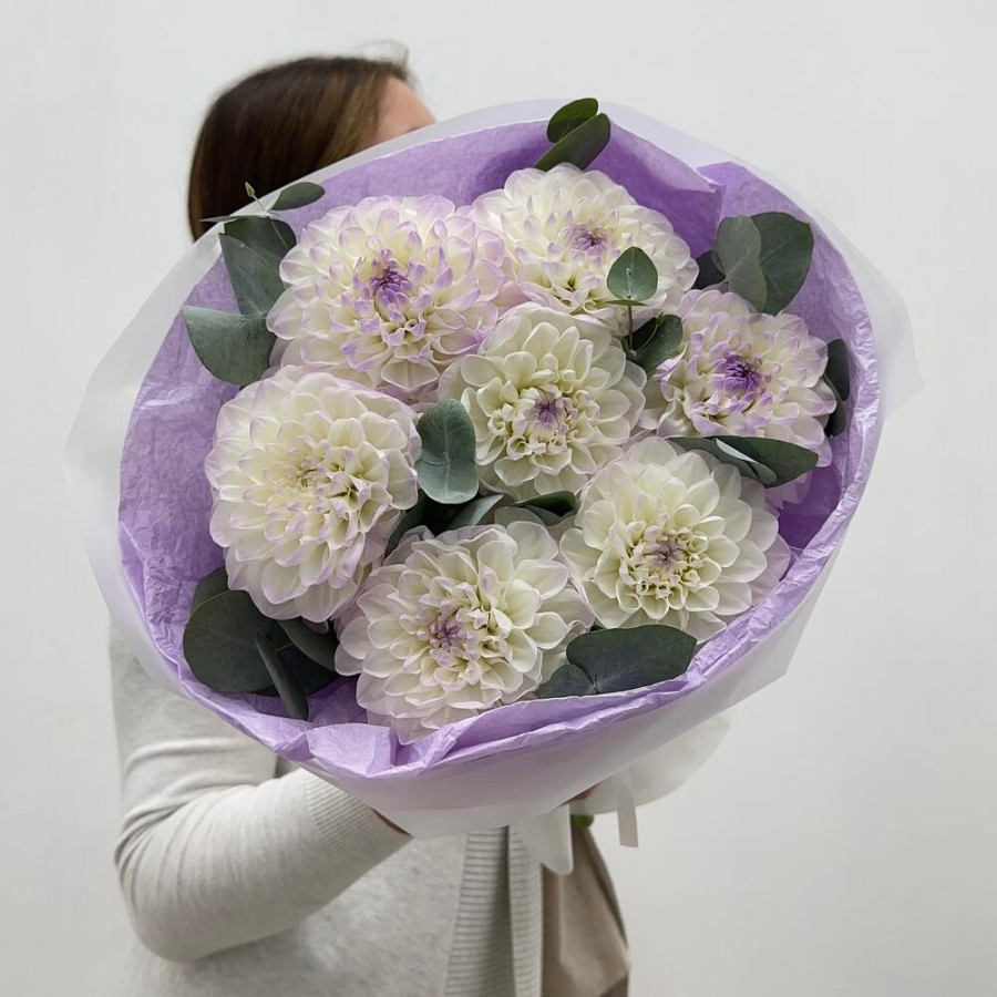 Букет из 7 бело-лиловых георгин с эвкалиптом в Вольске