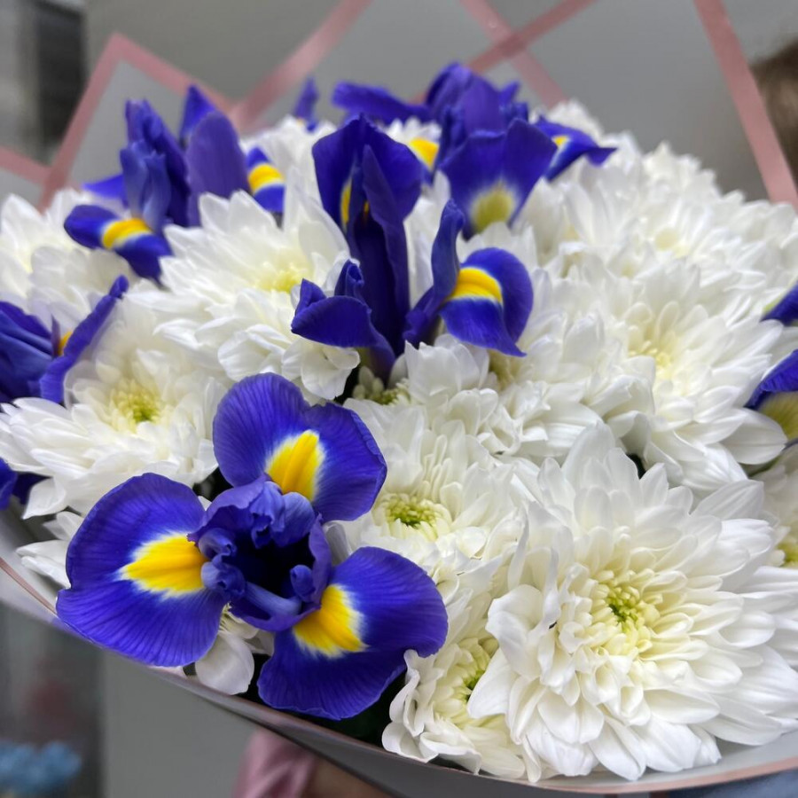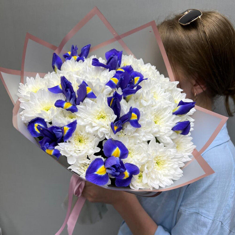 На фото букет «снежная сказка». В составе: ирис 10 шт, хризантема кустовая 5 шт, дизайнерская упаковка 1 шт, атласная лента 1 шт, . Все цветы свежие и ароматные, букет красиво оформлен и отлично подходит для подарка. Доступна доставка цветов или самовывоз.